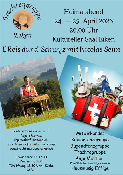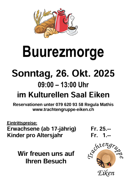 Dies zeigen wir bei verschiedensten Heimat- und Volksfesten, am Erntedankfest in der Kirche oder am Buurezmorge in Eiken. Eine eigene Tracht zu besitzen ist nicht die erste Voraussetzung.