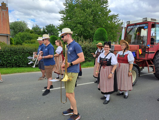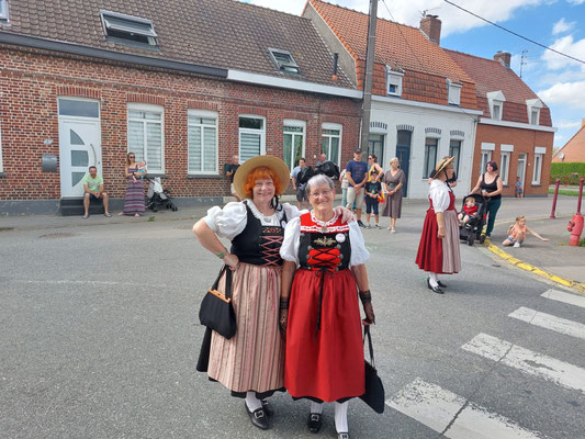 Am Samstag fahren zwei Cars mit den Gästen aus Deutschland, Belgien und der Schweiz zum Freilichtmuseum St. Joseph. Dort haben wir Zeit, die typischen Gebäude der Region zu bestaunen. Sie sind mit antiken Gegenständen aus diversen Berufskategorien gefüllt. Zur Mittagszeit wird uns ein Sandwich mit Chips und Getränken offeriert. Danach fährt der Car weiter Richtung Atlantikküste, wo wir am Horizont sogar die Klippen von Dover (England) sehen. In Wissant verbringen wir zwei Stunden am Strand, im Meer oder in den gemütlichen Beizli im Dorf, bevor die Fahrt zum Cap-Gris weitergeht. Dort können wir kurz die Aussicht beim Leuchtturm geniessen. Anschliessend fahren die beiden Cars wieder nach Eecken zurück. Den Abend lassen wir mit unseren Gastfamilien beim Festzelt ausklingen, wobei auch der heutige DJ die Musik viel zu laut aufdreht. Am Sonntag besuchen Anna Maria, Benedikta, Bea und Agi den Gottesdienst und nehmen auch an der Kranzniederlegung bei den gefallenen Soldaten des 1. Weltkriegs teil. Hanspeter, Irina und ich werden von unserer Gastfamilie zum belgischen Ypre gefahren. Eine wunderschöne Stadt in der Nähe von Eecke. Da die Trachtengruppe für den offiziellen Festakt nicht verlangt wird, sind wir frei bis um halb drei, wo wir uns für den Umzug treffen. Wir machen uns auf den Weg zum Aufstellen, wo wir unterwegs Jacques, den Bürgermeister von Eecke, sehen. Er hält sogleich die Kutsche, die wir eigentlich überholen, an und so dürfen Irina und ich mit der Kutsche zum Ausgangspunkt fahren. Unterwegs gabeln wir noch Benedikta auf. Wir haben es sehr lustig und amüsieren uns. Leider vergeht uns anschliessend das Lachen. Die MG Eiken ist die vorderste Gruppe hinter der Kutsche und wir schliessen uns ihr gleich an. Obwohl wir die vordersten sind, müssen wir öfters und länger anhalten und keiner weiss warum, und ob und wo es weitergeht. Bei sommerlichen Temperaturen fragen wir irgendwann die kursierenden Verantwortlichen nach Getränken, die wir prompt erhalten. Die Leute am Strassenrand erfreuen sich sehr über uns – kennen sie doch so etwas wie eine Trachtengruppe nicht. Nach dem Umzugsende spielt die MG Eiken nochmals ein Ständchen im Festzelt, wobei Irina und ich zum „Heidi“ tanzen. Ein Lied spielen sie sogar mit einer anderen Musikgesellschaft zusammen. Abends ist wieder Partystimmung mit DJ angesagt und um 23.00 Uhr kommen wir noch in den Genuss eines ¼-stündigen Feuerwerks. Am Montag wird allen Gästen und Gastgebern ein gemeinsames Frühstück serviert und dann heisst es bereits wieder Abschied nehmen, was den einen etwas leichter und den anderen etwas schwerer fällt. Nach gut 10 Stunden inklusive zwei Pausen kommen wir müde aber wohlbehalten wieder in Eiken an und verteilen uns wieder nach Hause.